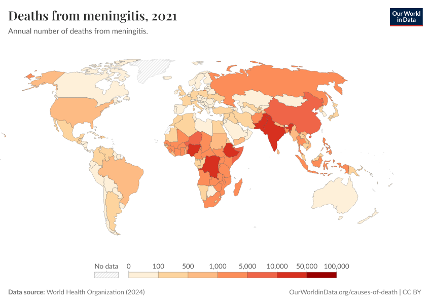 World Health Organization (2024) – with major processing by Our World in Data. “Deaths from meningitis” [dataset]. World Health Organization, “Global Health Estimates” [original data]. Retrieved February 24, 2026 from https://enhance-catalog-improvements.owid.pages.dev:8789/20250909-093708/grapher/deaths-from-meningitis-ghe.html (archived on September 9, 2025).