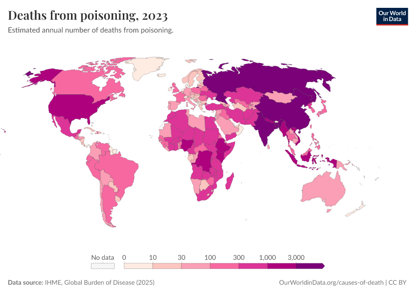 IHME, Global Burden of Disease (2025) – with major processing by Our World in Data. “Deaths from poisoning” [dataset]. IHME, Global Burden of Disease, “Global Burden of Disease - Deaths” [original data]. Retrieved February 24, 2026 from https://enhance-catalog-improvements.owid.pages.dev:8789/20260211-174736/grapher/deaths-from-poisoning.html (archived on February 11, 2026).