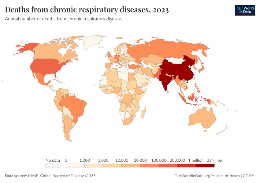 IHME, Global Burden of Disease (2025) – with major processing by Our World in Data. “Deaths from chronic respiratory diseases” [dataset]. IHME, Global Burden of Disease, “Global Burden of Disease - Deaths” [original data]. Retrieved February 24, 2026 from https://enhance-catalog-improvements.owid.pages.dev:8789/20260211-174736/grapher/deaths-from-respiratory-disease.html (archived on February 11, 2026).
