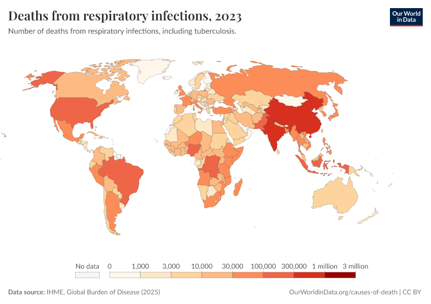 “Data Page: Deaths from respiratory infections”, part of the following publication: Esteban Ortiz-Ospina and Max Roser (2016) - “Global Health”. Data adapted from IHME, Global Burden of Disease. Retrieved from https://enhance-catalog-improvements.owid.pages.dev:8789/20260211-174736/grapher/deaths-from-respiratory-infections.html [online resource] (archived on February 11, 2026).How to cite this data