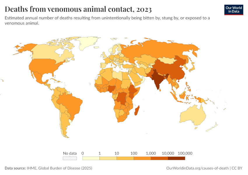 IHME, Global Burden of Disease (2025) – with major processing by Our World in Data. “Deaths from venomous animal contact” [dataset]. IHME, Global Burden of Disease, “Global Burden of Disease - Deaths” [original data]. Retrieved February 24, 2026 from https://enhance-catalog-improvements.owid.pages.dev:8789/20260211-174736/grapher/deaths-from-venomous-animal-contact.html (archived on February 11, 2026).