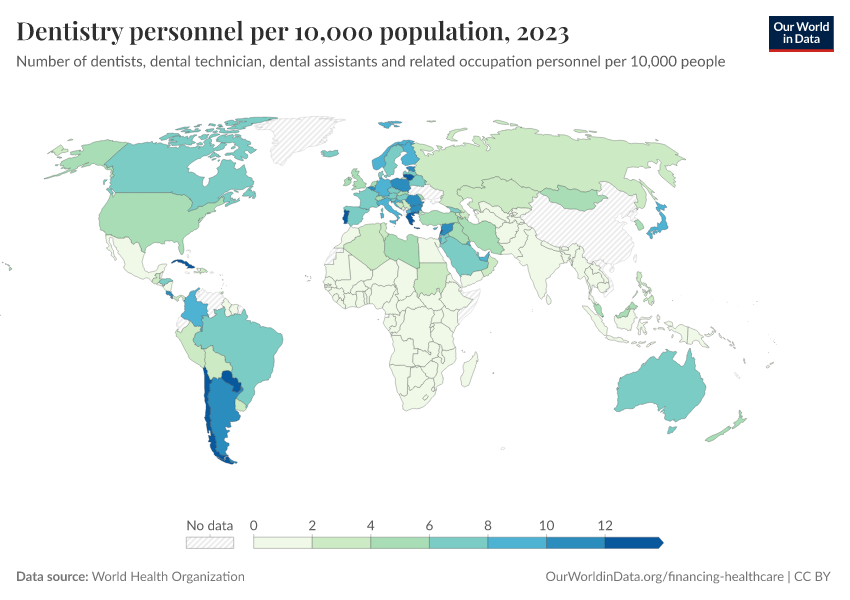“Data Page: Dentistry personnel per 10,000 population”. Our World in Data (2026). Data adapted from World Health Organization. Retrieved from https://enhance-catalog-improvements.owid.pages.dev:8789/20260130-180113/grapher/dentistry-personnel-per-1000.html [online resource] (archived on January 30, 2026).How to cite this data