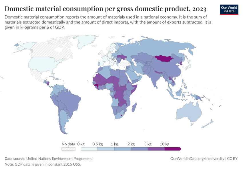 “Data Page: Domestic material consumption per gross domestic product”. Our World in Data (2026). Data adapted from United Nations Environment Programme. Retrieved from https://enhance-catalog-improvements.owid.pages.dev:8789/20260130-180113/grapher/domestic-material-consumption-per-unit-of-gdp.html [online resource] (archived on January 30, 2026).How to cite this data