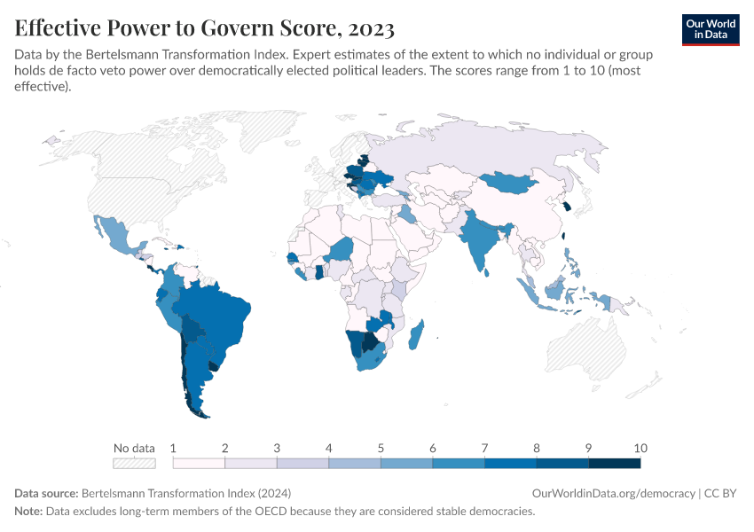 “Data Page: Effective Power to Govern Score”, part of the following publication: Bastian Herre, Lucas Rodés-Guirao, and Esteban Ortiz-Ospina (2013) - “Democracy”. Data adapted from Bertelsmann Transformation Index. Retrieved from https://enhance-catalog-improvements.owid.pages.dev:8789/20260204-170225/grapher/effective-power-to-govern-score-bti.html [online resource] (archived on February 4, 2026).How to cite this data