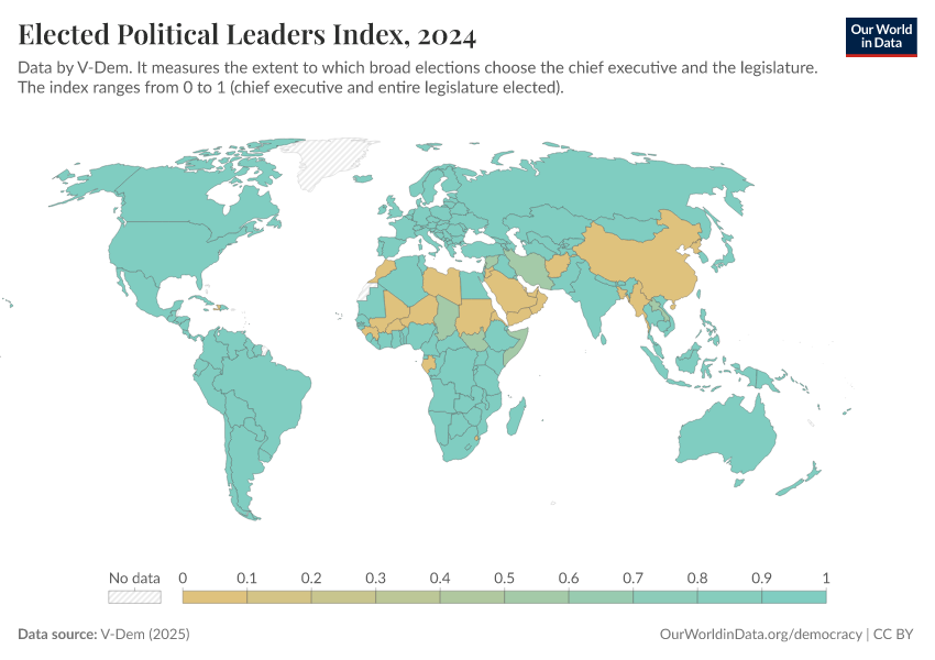 V-Dem (2025) – processed by Our World in Data. “Elected officials index” [dataset]. V-Dem, “Democracy report v15” [original data]. Retrieved February 24, 2026 from https://enhance-catalog-improvements.owid.pages.dev:8789/20260119-070102/grapher/elected-political-leaders-index.html (archived on January 19, 2026).