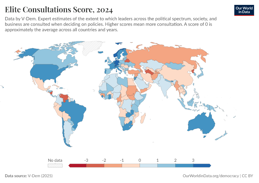 “Data Page: Elite consultation”, part of the following publication: Bastian Herre, Lucas Rodés-Guirao, and Esteban Ortiz-Ospina (2013) - “Democracy”. Data adapted from V-Dem. Retrieved from https://enhance-catalog-improvements.owid.pages.dev:8789/20260204-170225/grapher/elite-consultations-score.html [online resource] (archived on February 4, 2026).How to cite this data
