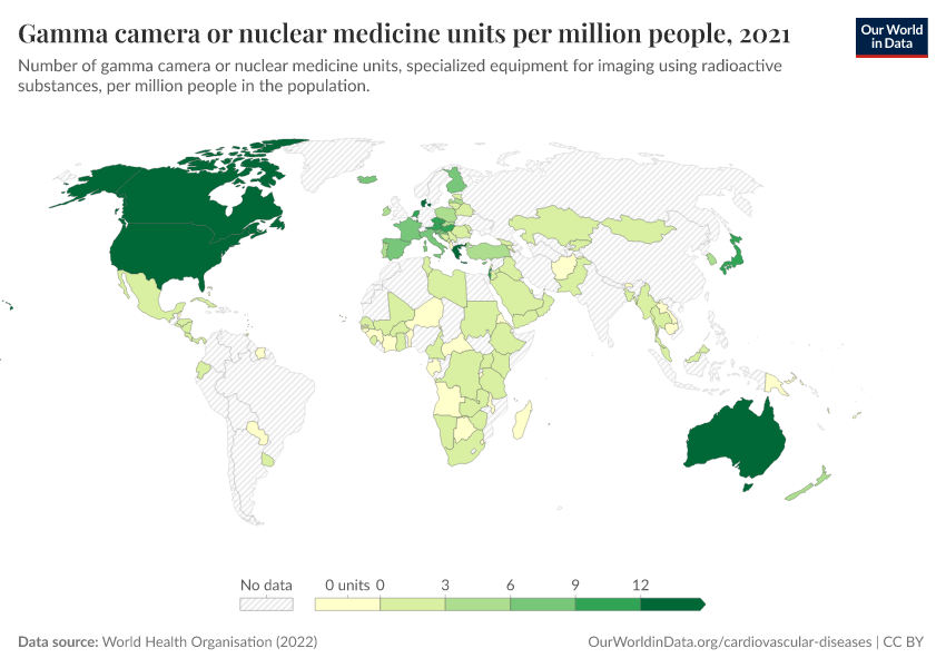 “Data Page: Gamma camera or nuclear medicine units per million people”, part of the following publication: Saloni Dattani, Veronika Samborska, Hannah Ritchie, and Max Roser (2023) - “Cardiovascular Diseases”. Data adapted from World Health Organisation. Retrieved from https://enhance-catalog-improvements.owid.pages.dev:8789/20250909-093708/grapher/gamma-camera-or-nuclear-medicine-availability.html [online resource] (archived on September 9, 2025).How to cite this data
