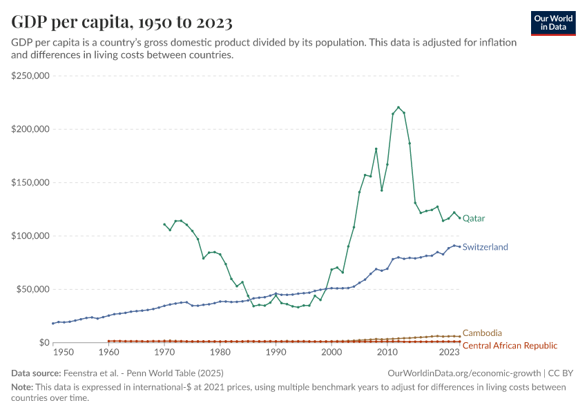 “Data Page: GDP per capita”, part of the following publication: Max Roser, Bertha Rohenkohl, Pablo Arriagada, Joe Hasell, Hannah Ritchie, and Esteban Ortiz-Ospina (2023) - “Economic Growth”. Data adapted from Feenstra et al.. Retrieved from https://enhance-catalog-improvements.owid.pages.dev:8789/20251013-111729/grapher/gdp-per-capita-penn-world-table.html [online resource] (archived on October 13, 2025).