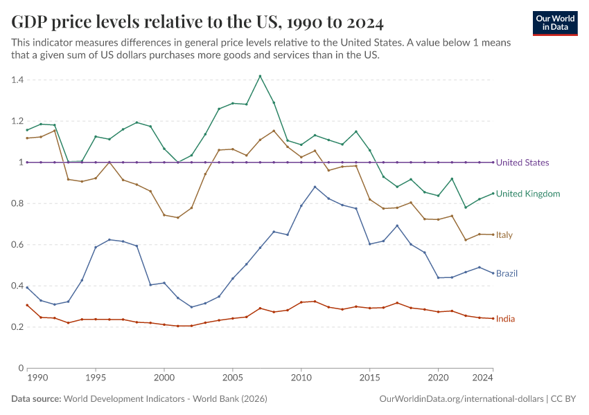 World Development Indicators - World Bank (2026) – processed by Our World in Data. “GDP price levels relative to the US – World Bank” [dataset]. World Development Indicators - World Bank, “World Development Indicators 125” [original data]. Retrieved February 24, 2026 from https://enhance-catalog-improvements.owid.pages.dev:8789/20260202-180243/grapher/gdp-price-levels-relative-to-the-us.html (archived on February 2, 2026).
