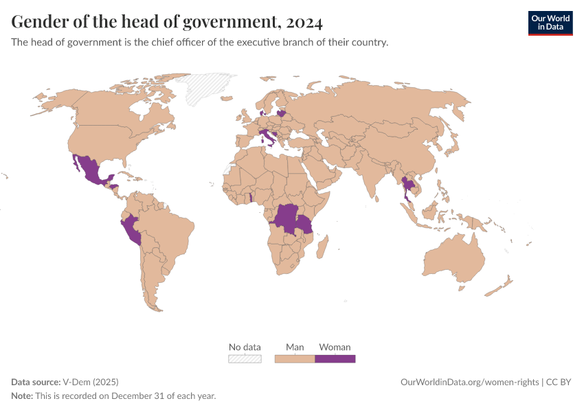 V-Dem (2025) – processed by Our World in Data. “Gender of the head of government” [dataset]. V-Dem, “Democracy report v15” [original data]. Retrieved February 24, 2026 from https://enhance-catalog-improvements.owid.pages.dev:8789/20260119-070102/grapher/gender-of-the-head-of-government.html (archived on January 19, 2026).