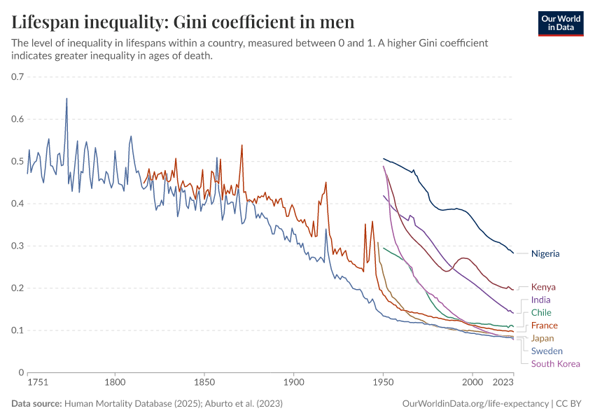 “Data Page: Lifespan inequality: Gini coefficient in men”, part of the following publication: Saloni Dattani, Lucas Rodés-Guirao, Hannah Ritchie, Esteban Ortiz-Ospina, and Max Roser (2023) - “Life Expectancy”. Data adapted from Human Mortality Database, United Nations. Retrieved from https://enhance-catalog-improvements.owid.pages.dev:8789/20251022-222946/grapher/gini-coefficient-of-lifespan-inequality-in-males.html [online resource] (archived on October 22, 2025).How to cite this data