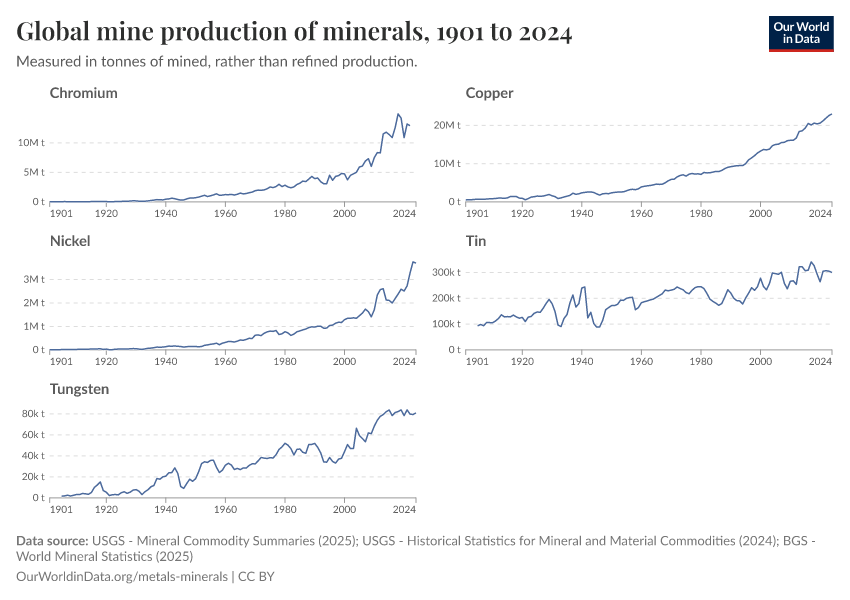 USGS - Mineral Commodity Summaries (2025); USGS - Historical Statistics for Mineral and Material Commodities (2024); BGS - World Mineral Statistics (2025) – with major processing by Our World in Data. “Global mine production of minerals” [dataset]. United States Geological Survey, “Mineral Commodity Summaries”; United States Geological Survey, “Historical Statistics for Mineral and Material Commodities”; British Geological Survey, “World Mineral Statistics” [original data]. Retrieved February 24, 2026 from https://enhance-catalog-improvements.owid.pages.dev:8789/20260116-170644/grapher/global-mine-production-minerals.html (archived on January 16, 2026).