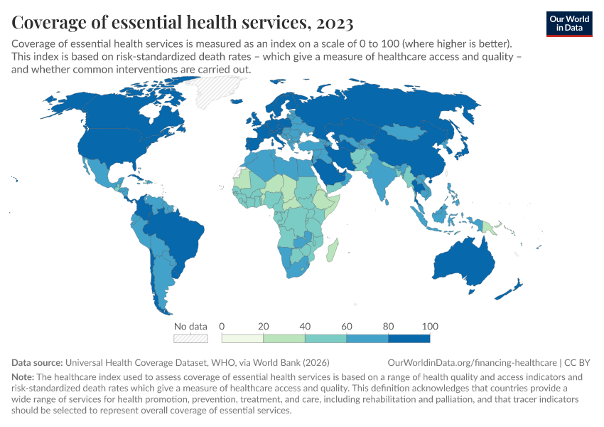 “Data Page: Coverage of essential health services”. Our World in Data (2026). Data adapted from Universal Health Coverage Dataset, WHO, via World Bank. Retrieved from https://enhance-catalog-improvements.owid.pages.dev:8789/20260202-181317/grapher/healthcare-access-quality-un.html [online resource] (archived on February 2, 2026).How to cite this data