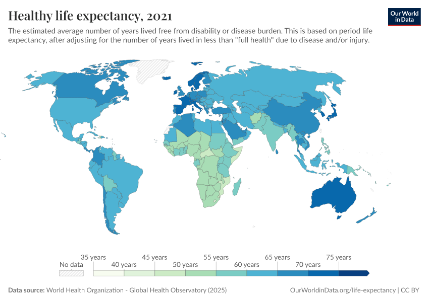 “Data Page: Healthy life expectancy”. Our World in Data (2026). Data adapted from World Health Organization. Retrieved from https://enhance-catalog-improvements.owid.pages.dev:8789/20260119-070102/grapher/healthy-life-expectancy-at-birth.html [online resource] (archived on January 19, 2026).How to cite this data