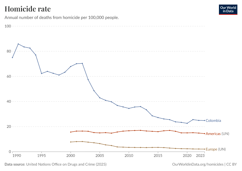 UN, World Population Prospects (2024); United Nations Office on Drugs and Crime (2025) – with minor processing by Our World in Data. “Homicide rate per 100,000 population” [dataset]. United Nations Office on Drugs and Crime, “United Nations Office on Drugs and Crime - Intentional Homicide Victims”; United Nations, “World Population Prospects”; Various sources, “Population” [original data]. Retrieved February 24, 2026 from https://enhance-catalog-improvements.owid.pages.dev:8789/20260119-065148/grapher/homicide-rate-unodc.html (archived on January 19, 2026).