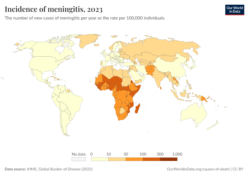 “Data Page: Incidence of meningitis”, part of the following publication: Esteban Ortiz-Ospina and Max Roser (2016) - “Global Health”. Data adapted from IHME, Global Burden of Disease. Retrieved from https://enhance-catalog-improvements.owid.pages.dev:8789/20260212-172859/grapher/incidence-of-meningitis.html [online resource] (archived on February 12, 2026).How to cite this data