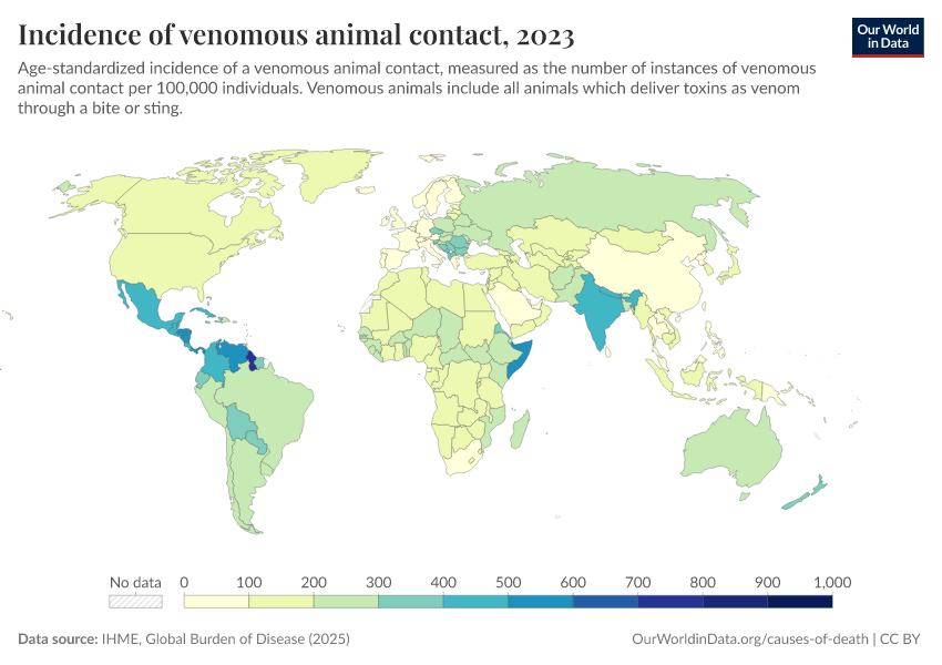 “Data Page: Incidence of venomous animal contact”, part of the following publication: Esteban Ortiz-Ospina and Max Roser (2016) - “Global Health”. Data adapted from IHME, Global Burden of Disease. Retrieved from https://enhance-catalog-improvements.owid.pages.dev:8789/20260212-172132/grapher/incidence-of-venomous-animal-contact.html [online resource] (archived on February 12, 2026).How to cite this data