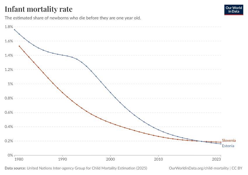 “Data Page: Infant mortality rate”, part of the following publication: Saloni Dattani, Fiona Spooner, Hannah Ritchie, and Max Roser (2023) - “Child and Infant Mortality”. Data adapted from United Nations Inter-agency Group for Child Mortality Estimation, Various sources. Retrieved from https://enhance-catalog-improvements.owid.pages.dev:8789/20260119-070102/grapher/infant-mortality.html [online resource] (archived on January 19, 2026).