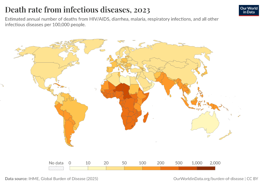 IHME, Global Burden of Disease (2025) – with major processing by Our World in Data. “Death rate from infectious diseases” [dataset]. IHME, Global Burden of Disease, “Global Burden of Disease - Deaths” [original data]. Retrieved February 24, 2026 from https://enhance-catalog-improvements.owid.pages.dev:8789/20260211-174736/grapher/infectious-disease-death-rates-gbd.html (archived on February 11, 2026).
