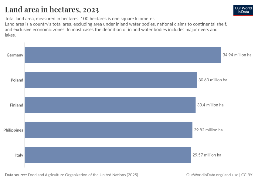 “Data Page: Land area in hectares”, part of the following publication: Hannah Ritchie, Pablo Rosado, and Max Roser (2023) - “Agricultural Production”. Data adapted from Food and Agriculture Organization of the United Nations. Retrieved from https://enhance-catalog-improvements.owid.pages.dev:8789/20260119-235736/grapher/land-area-hectares.html [online resource] (archived on January 19, 2026).