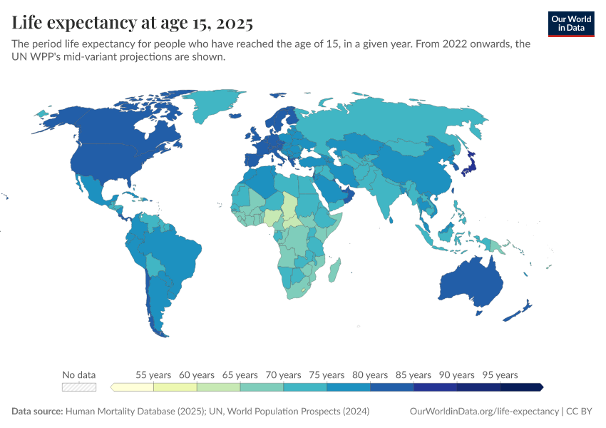 Human Mortality Database (2025); UN, World Population Prospects (2024) – with major processing by Our World in Data. “Life expectancy at 15 – HMD, UN WPP – period tables, with UN medium projections” [dataset]. Human Mortality Database, “Human Mortality Database”; United Nations, “World Population Prospects” [original data]. Retrieved February 24, 2026 from https://enhance-catalog-improvements.owid.pages.dev:8789/20251022-222946/grapher/life-expectancy-at-age-15.html (archived on October 22, 2025).