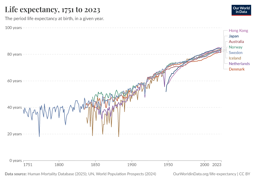 “Data Page: Life expectancy at birth”, part of the following publication: Saloni Dattani, Lucas Rodés-Guirao, Hannah Ritchie, Esteban Ortiz-Ospina, and Max Roser (2023) - “Life Expectancy”. Data adapted from Human Mortality Database, United Nations. Retrieved from https://enhance-catalog-improvements.owid.pages.dev:8789/20251022-222946/grapher/life-expectancy-hmd-unwpp.html [online resource] (archived on October 22, 2025).How to cite this data