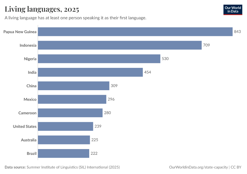 “Data Page: Living languages”, part of the following publication: Bastian Herre and Pablo Arriagada (2023) - “State Capacity”. Data adapted from Summer Institute of Linguistics (SIL) International. Retrieved from https://enhance-catalog-improvements.owid.pages.dev:8789/20251023-195030/grapher/living-languages.html [online resource] (archived on October 23, 2025).