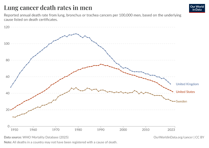 “Data Page: Lung cancer death rates in men”, part of the following publication: Saloni Dattani, Fiona Spooner, Hannah Ritchie, and Max Roser (2023) - “Causes of Death”. Data adapted from WHO Mortality Database. Retrieved from https://enhance-catalog-improvements.owid.pages.dev:8789/20250909-093708/grapher/lung-cancer-death-rates-males.html [online resource] (archived on September 9, 2025).How to cite this data