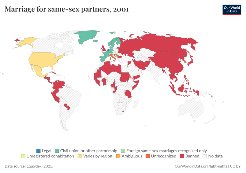 “Data Page: Marriage for same-sex partners”, part of the following publication: Bastian Herre and Pablo Arriagada (2023) - “LGBT+ Rights”. Data adapted from Equaldex. Retrieved from https://enhance-catalog-improvements.owid.pages.dev:8789/20250909-093708/grapher/marriage-same-sex-partners-equaldex.html [online resource] (archived on September 9, 2025).
