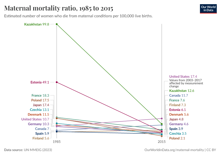 UN MMEIG (2023) – processed by Our World in Data. “Maternal mortality ratio” [dataset]. UN MMEIG (WHO, UNICEF, UNFPA, World Bank Group and UNDESA/ Population Division), “Trends in maternal mortality 2020” [original data]. Retrieved February 24, 2026 from https://enhance-catalog-improvements.owid.pages.dev:8789/20260119-065148/grapher/maternal-mortality-slope-chart.html (archived on January 19, 2026).