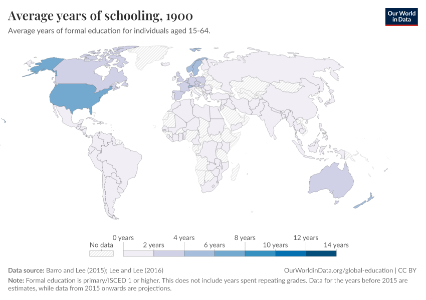Barro and Lee (2015); Lee and Lee (2016) – with major processing by Our World in Data. “Average years of schooling” [dataset]. Barro and Lee, “Projections of Educational Attainment”; Lee and Lee, “Human Capital in the Long Run” [original data]. Retrieved February 24, 2026 from https://enhance-catalog-improvements.owid.pages.dev:8789/20260119-070102/grapher/mean-years-of-schooling-long-run.html (archived on January 19, 2026).