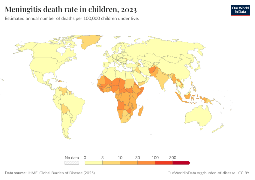 IHME, Global Burden of Disease (2025) – with major processing by Our World in Data. “Meningitis death rate in children” [dataset]. IHME, Global Burden of Disease, “Global Burden of Disease - Deaths” [original data]. Retrieved February 24, 2026 from https://enhance-catalog-improvements.owid.pages.dev:8789/20260211-174736/grapher/meningitis-death-rates-children-under-5.html (archived on February 11, 2026).