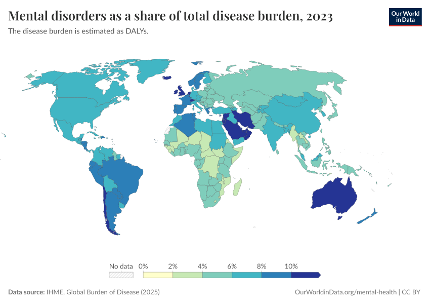 IHME, Global Burden of Disease (2025) – with major processing by Our World in Data. “Mental disorders as a share of total disease burden” [dataset]. IHME, Global Burden of Disease, “Global Burden of Disease - DALYs” [original data]. Retrieved February 24, 2026 from https://enhance-catalog-improvements.owid.pages.dev:8789/20260211-174736/grapher/mental-and-substance-use-as-share-of-disease.html (archived on February 11, 2026).