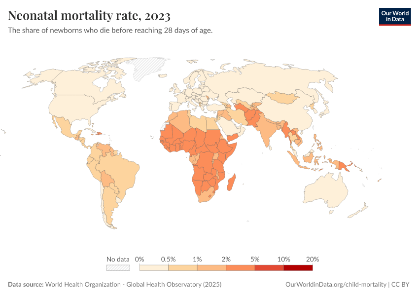 World Health Organization - Global Health Observatory (2025) – processed by Our World in Data. “Neonatal mortality rate” [dataset]. World Health Organization, “Global Health Observatory” [original data]. Retrieved February 24, 2026 from https://enhance-catalog-improvements.owid.pages.dev:8789/20260119-070102/grapher/neonatal-mortality-rate-gho.html (archived on January 19, 2026).