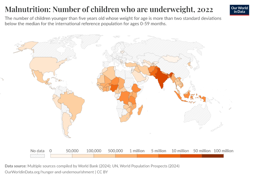 “Data Page: Number of underweight children”. Our World in Data (2026). Data adapted from UNICEF, WHO, World Bank, United Nations. Retrieved from https://enhance-catalog-improvements.owid.pages.dev:8789/20260119-070102/grapher/number-of-children-who-are-underweight.html [online resource] (archived on January 19, 2026).How to cite this data