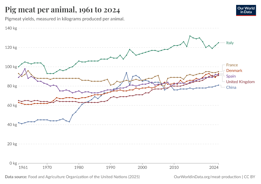 Food and Agriculture Organization of the United Nations (2025) – with major processing by Our World in Data. “Pig meat yield per animal – UN FAO” [dataset]. Food and Agriculture Organization of the United Nations, “Production: Crops and livestock products” [original data]. Retrieved February 24, 2026 from https://enhance-catalog-improvements.owid.pages.dev:8789/20260116-143329/grapher/pig-yields-meat-per-animal-in-hectograms-100-grams.html (archived on January 16, 2026).