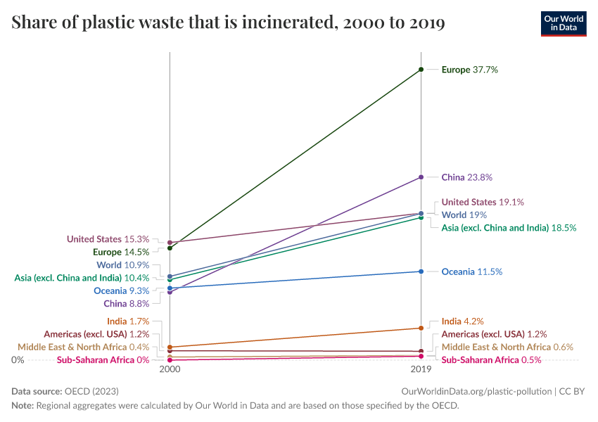 “Data Page: Share of plastic waste that is incinerated”, part of the following publication: Hannah Ritchie, Veronika Samborska, and Max Roser (2023) - “Plastic Pollution”. Data adapted from OECD. Retrieved from https://enhance-catalog-improvements.owid.pages.dev:8789/20250909-093708/grapher/plastic-waste-incinerated.html [online resource] (archived on September 9, 2025).How to cite this data