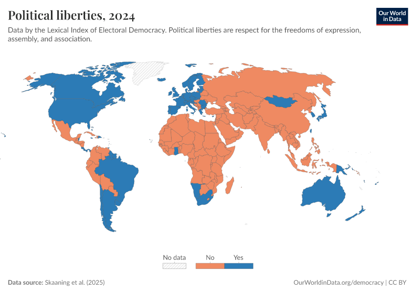 Skaaning et al. (2025) – processed by Our World in Data. “Political liberties” [dataset]. Skaaning et al., “Lexical Index of Electoral Democracy (LIED) v6.8” [original data]. Retrieved February 24, 2026 from https://enhance-catalog-improvements.owid.pages.dev:8789/20260119-065148/grapher/political-liberties-lexical.html (archived on January 19, 2026).