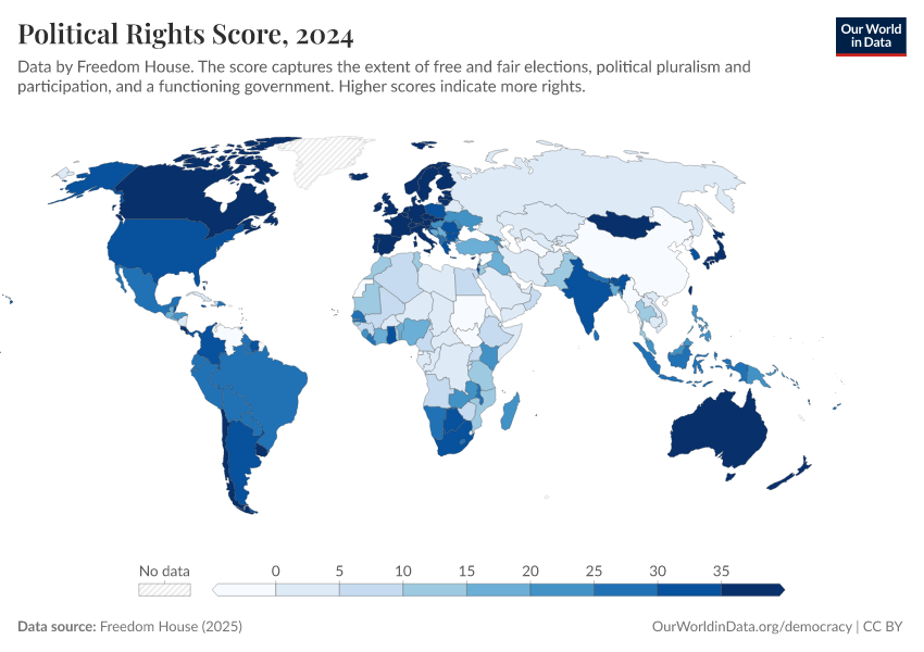 Freedom House (2025) – processed by Our World in Data. “Political Rights Score” [dataset]. Freedom House, “Freedom in the World” [original data]. Retrieved February 24, 2026 from https://enhance-catalog-improvements.owid.pages.dev:8789/20260204-170225/grapher/political-rights-score-fh.html (archived on February 4, 2026).