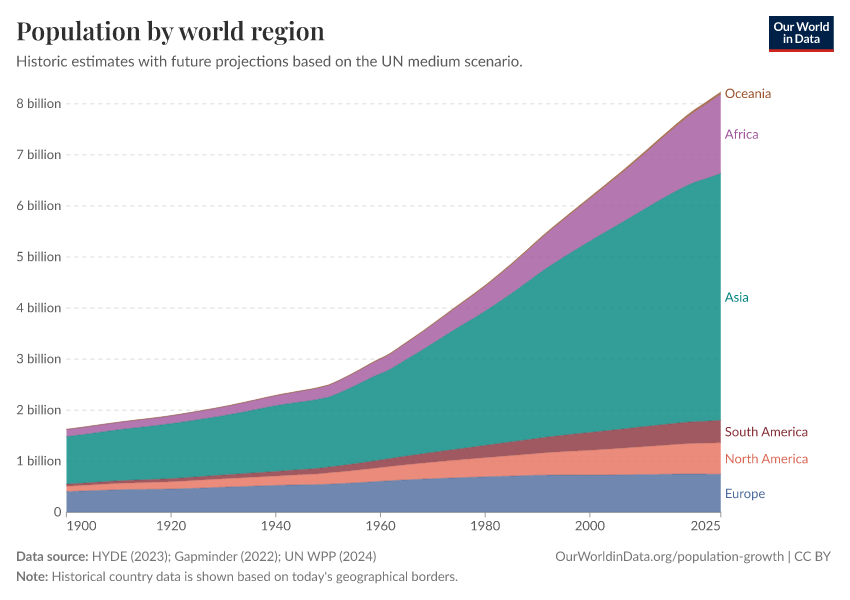 “Data Page: Population by world region”, part of the following publication: Hannah Ritchie, Lucas Rodés-Guirao, Edouard Mathieu, Marcel Gerber, Esteban Ortiz-Ospina, Joe Hasell, and Max Roser (2023) - “Population Growth”. Data adapted from PBL Netherlands Environmental Assessment Agency, Gapminder, United Nations. Retrieved from https://enhance-catalog-improvements.owid.pages.dev:8789/20260119-065148/grapher/population-regions-with-projections.html [online resource] (archived on January 19, 2026).How to cite this data