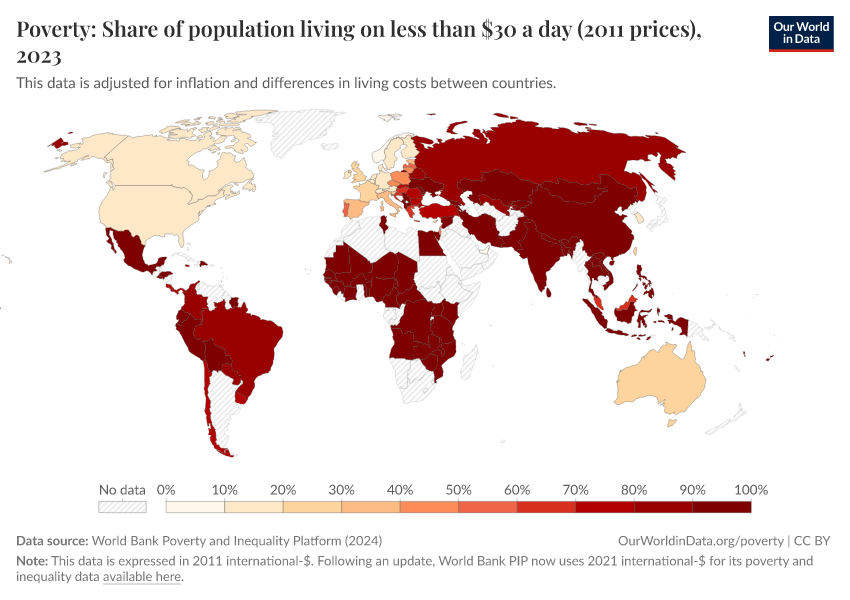 World Bank Poverty and Inequality Platform (2024) – with major processing by Our World in Data. “Poverty: Share of population living on less than $30 a day (2011 prices) – World Bank” [dataset]. World Bank Poverty and Inequality Platform, “World Bank Poverty and Inequality Platform (PIP) 20240627_2017, 20240627_2011” [original data]. Retrieved February 24, 2026 from https://enhance-catalog-improvements.owid.pages.dev:8789/20251022-091218/grapher/poverty-share-on-less-than-30-per-day-2011-ppp.html (archived on October 22, 2025).