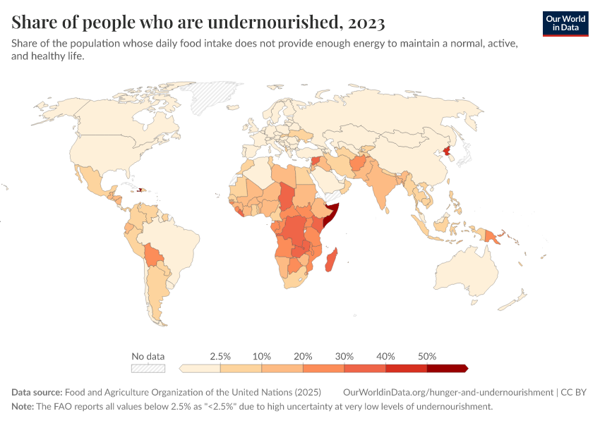 - Many countries, especially high-income ones, are shown at 2.5% because the FAO reports values between 0% and 2.5% as "<2.5%", due to uncertainty at very low levels of undernourishment.