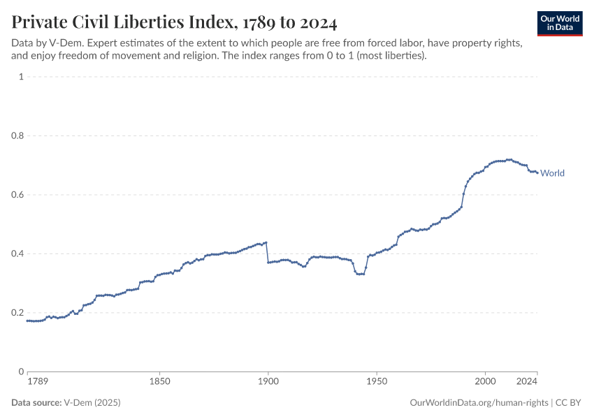 “Data Page: Private civil liberties index”, part of the following publication: Bastian Herre, Lucas Rodés-Guirao, and Esteban Ortiz-Ospina (2013) - “Democracy”. Data adapted from V-Dem. Retrieved from https://enhance-catalog-improvements.owid.pages.dev:8789/20260119-070102/grapher/private-civil-liberties-index.html [online resource] (archived on January 19, 2026).How to cite this data
