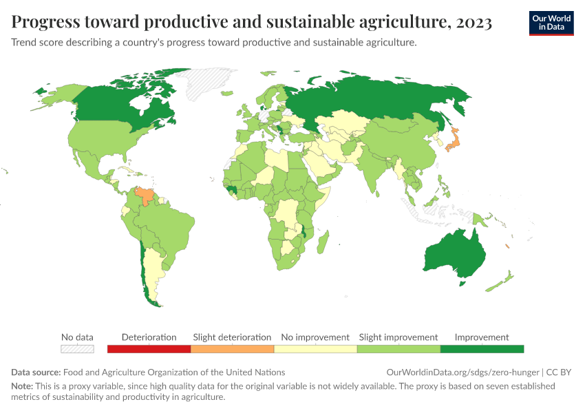 “Data Page: Progress toward productive and sustainable agriculture”. Our World in Data (2026). Data adapted from Food and Agriculture Organization of the United Nations. Retrieved from https://enhance-catalog-improvements.owid.pages.dev:8789/20260130-180113/grapher/progress-toward-productive-and-sustainable-agriculture.html [online resource] (archived on January 30, 2026).How to cite this data