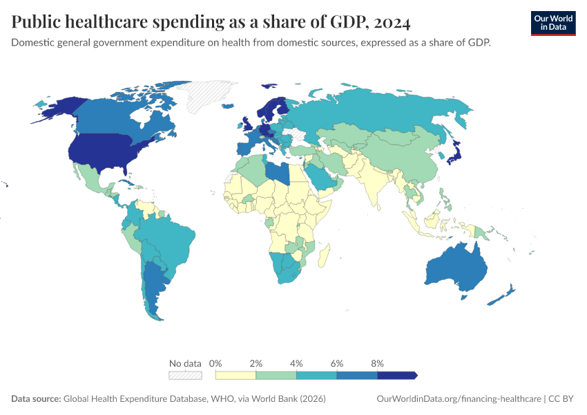 “Data Page: Public healthcare spending as a share of GDP”. Our World in Data (2026). Data adapted from Global Health Expenditure Database, WHO, via World Bank. Retrieved from https://enhance-catalog-improvements.owid.pages.dev:8789/20260202-181317/grapher/public-healthcare-spending-share-gdp.html [online resource] (archived on February 2, 2026).How to cite this data