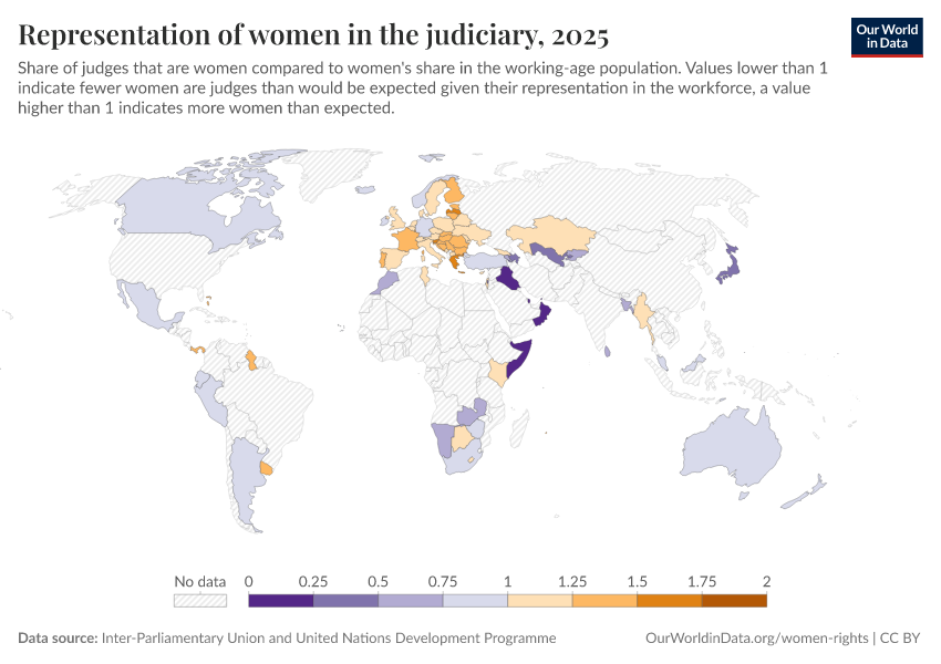 “Data Page: Representation of women in the judiciary”. Our World in Data (2026). Data adapted from Inter-Parliamentary Union and United Nations Development Programme. Retrieved from https://enhance-catalog-improvements.owid.pages.dev:8789/20260105-133053/grapher/representation-of-women-in-the-judiciary.html [online resource] (archived on January 5, 2026).How to cite this data