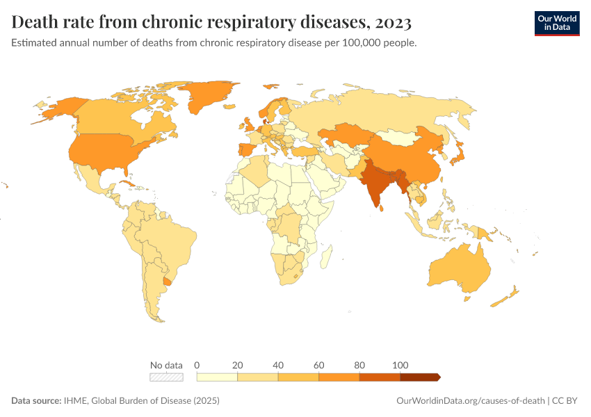 IHME, Global Burden of Disease (2025) – with major processing by Our World in Data. “Death rate from chronic respiratory diseases” [dataset]. IHME, Global Burden of Disease, “Global Burden of Disease - Deaths” [original data]. Retrieved February 24, 2026 from https://enhance-catalog-improvements.owid.pages.dev:8789/20260211-174736/grapher/respiratory-disease-death-rate-gbd.html (archived on February 11, 2026).
