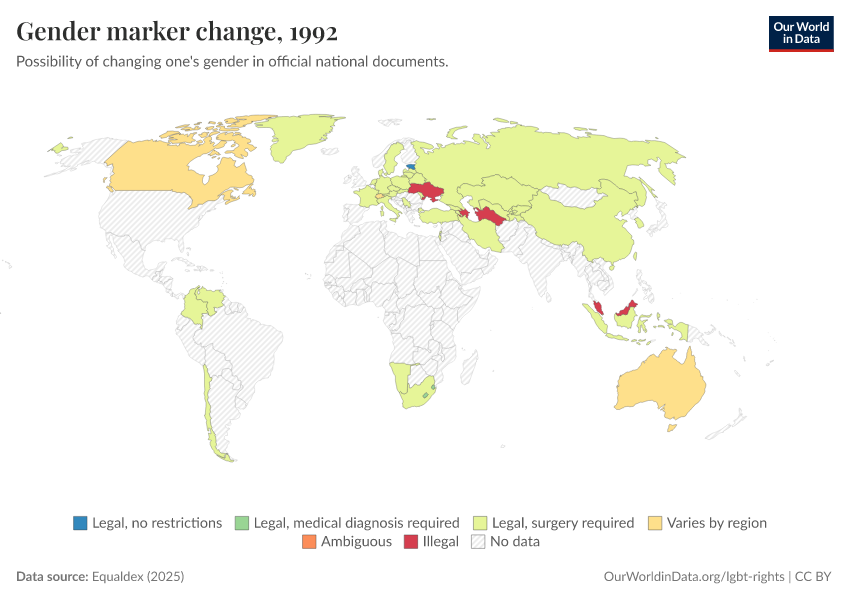 “Data Page: Gender marker change”, part of the following publication: Bastian Herre and Pablo Arriagada (2023) - “LGBT+ Rights”. Data adapted from Equaldex. Retrieved from https://enhance-catalog-improvements.owid.pages.dev:8789/20250909-093708/grapher/right-to-change-legal-gender-equaldex.html [online resource] (archived on September 9, 2025).How to cite this data