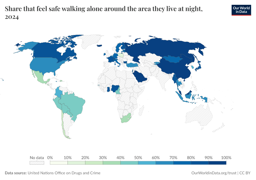 “Data Page: Share that feel safe walking alone around the area they live at night”. Our World in Data (2026). Data adapted from United Nations Office on Drugs and Crime. Retrieved from https://enhance-catalog-improvements.owid.pages.dev:8789/20251120-211749/grapher/safety-walking-alone.html [online resource] (archived on November 20, 2025).How to cite this data