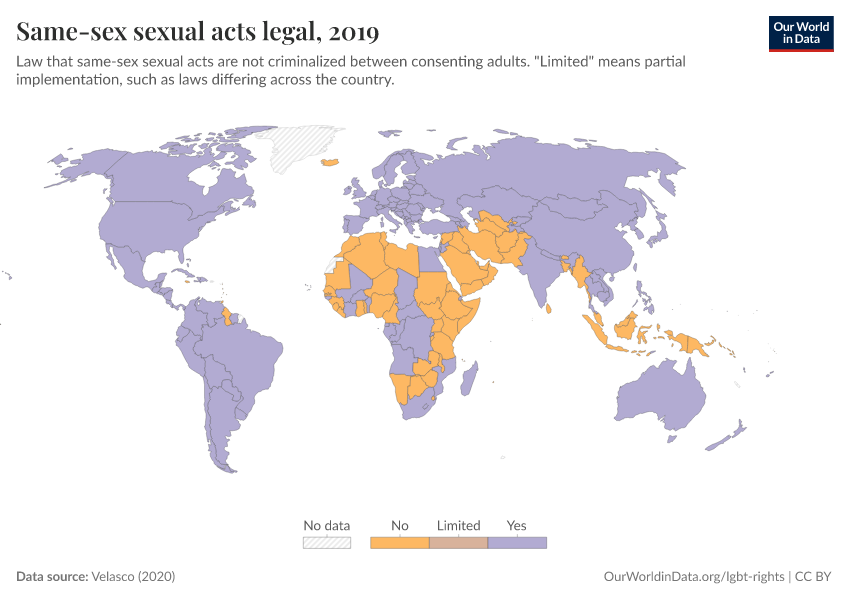 “Data Page: Same-sex sexual acts legal”, part of the following publication: Bastian Herre and Pablo Arriagada (2023) - “LGBT+ Rights”. Data adapted from Velasco. Retrieved from https://enhance-catalog-improvements.owid.pages.dev:8789/20251023-195030/grapher/same-sex-sexual-acts-legal.html [online resource] (archived on October 23, 2025).How to cite this data